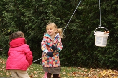 Tie one end of the rope to a rigid support like a window grill. Mark it A Tie a small bucket in the middle of the rope and mark it C. Pour two litres of water into the bucket. Pull the other end ‘B’ and try to make the rope straight as shown in the dotted line ADB.
