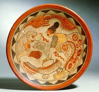 The question becomes, why cacao? According to the Popol Vuh, the Mayan creation text, the gods created humans from a combination of sweet things, maize, and cacao (Driess and Greenhill 2008, 18-22). In addition, many ancient artifacts depicted cacao offerings between gods such as the Mayan moon goddess IxChel and the rain god Chac who are seen trading cacao in an ancient Mayan depiction. This iconography rooted the tree’s capacity as a conduit of communication with the gods. Known as the “World Tree” or the “First Tree,” this crop became the tree of life and a cosmic metaphor linking the natural world to the spirit world. Thus, the offering of cacao functioned to symbolically connect diviners with the gods through ritual. The bounty of the cacao tree in Mesoamerica also created a metaphorical link to abundance, which was a request to the gods in agrarian and funerary rites. As Driess and Greenhill state, “Obsession with time and calendrical events fueled rituals during which cacao offerings helped to ensure the continuation of cosmic and agricultural cycles” (2008, 52). Cacao drinks were left in tombs and beans were used to adorn the bodies of the dead as it was believed that cacao had the power to energize the soul and aid in the transition to the supernatural world. The deep spiritual meaning of cacao catalyzed its importance in Olmec society.