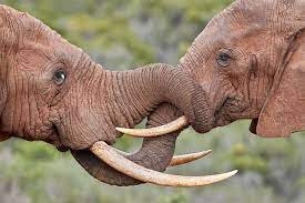 Elephants use their trunks much like people use their hands, and the ends of their trunks are more sensitive than human fingertips. Trunks have as many as 100,000 different muscles and play a central role in the animals’ communication with each other. Elephants stroke or caress each others’ heads and backs with their trunks to console or comfort loved ones. Calves place the tips of their trunks in their mothers’ mouths for reassurance — a gesture repeated by lower-ranking elephants in interactions with the herd’s matriarch. When engaging in courtship behavior, elephant couples engage in friendly trunk wrestling and entwine their trunks together.