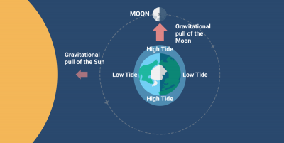All objects on Earth feel the gravitational pull of the Moon in addition to that of the Earth itself and of the Sun. But the Moon’s and the Sun’s gravitational forces are negligible compared to that of our planet, which is ten million times stronger. These forces increase with mass so they become important when considering all the water in the oceans. This makes tides possible: water closer to the Moon is attracted to it inducing high tides, while other regions on Earth experience low tides. When the Earth rotates, high tide regions rotate too, hence the periodicity of tides. But it’s not just about oceans: the Earth’s solid surface also experiences tides and can rise up to a few tens of centimetres! Even if you don’t feel them, these tides can have dramatic effects such as earthquakes and volcanic eruptions.