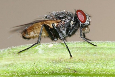 About 90 percent of all flies occurring in human habitations are houseflies. Once a major nuisance and hazard to public health in cities, houseflies are still a problem wherever decomposing organic waste and garbage are allowed to accumulate. The adult housefly is dull gray with dirty-yellowish areas on the abdomen and longitudinal lines on the thorax. Body size ranges from about 5 to 7 mm (0.2 to 0.3 inch), and the conspicuous compound eyes have approximately 4,000 facets. Because it has sponging or lapping mouthparts, the housefly cannot bite; a near relative, the stable fly, however, does bite. The housefly can walk on vertical window panes or hang upside down on a ceiling probably because of the surface-tension properties of a secretion produced by tiny glandular pads (pulvilli) beneath each claw on the feet. The female deposits more than 100 slender whitish eggs (0.8 to 1 mm long) at a time, producing between about 600 and 1,000 eggs in her life. These eggs hatch in 12 to 24 hours. After several molts the dirty-whitish maggots (larvae), about 12 mm long, transform into pupae. The adults, when developed, expand a pouch (ptilinum) on the head and break off the end of the puparium to emerge.