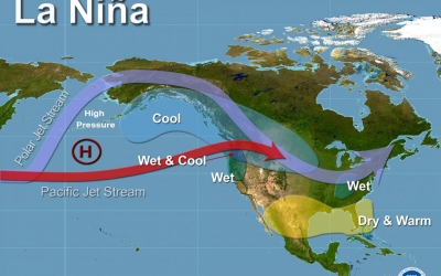 La Nina is a climatic pattern that refers to the cooling of the ocean surfaces along the tropical west coast of South America. During this weather pattern, warm ocean water and clouds move westwards increasing the chances of places like Indonesia and Australia getting much more rain than usual. These fluctuations tend to leave the regions of southwestern U.S. extremely dry.