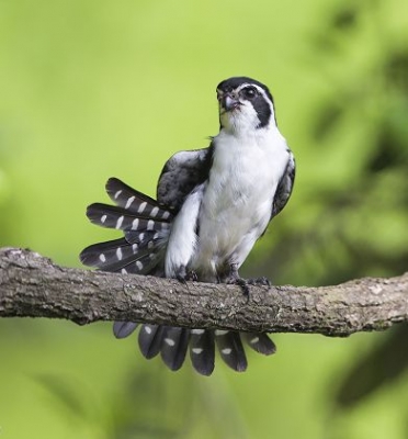The pied falconet, or Microhierax melanoleucos, is a small-sized raptor from the family Falconidae. It is found in the temperate forests of India, Bangladesh, Bhutan, China, Hong Kong, Laos and Vietnam. The pied falconet is about the size of a household sparrow and has the distinction of being the smallest falcon in the world. It is a black and white raptor weighing about 75 gms. It has a white face with a prominent black streak that runs through its eye backwards and downwards like an artist’s brush stroke. Its upper parts as well as its crown are black and its long tail is black with narrow white bands running across it. Its eyes are bright brown and its heavy feet are brownish black with sharp, well formed talons. It is also called ‘white-legged falconet’ and its call is a shrill, high pitched scream and chattering whistle.