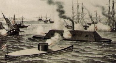 In 1862 the ships of the North were maintaining a blockade to prevent supplies reaching the South and the opposing vessels met in battle at Hampton Roads off the south-east coast of Virginia. Thousands of people lined the shores to watch the fight as the ships passed on opposite courses, turned and passed again.