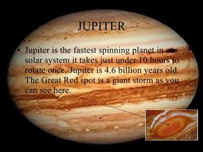 Jupiter is the 5th planet from the sun and it is the biggest of all planets in the solar system. It is a giant gaseous planet and about 2.5 times the size of all planets combined in the solar system. It spins on its axis in the opposite direction as opposed to most planets. Other gas planets include Saturn, Uranus, and Neptune. Jupiter is believed to have a solid core made of rocks. Like most other planets, Jupiter does not have a defined solid surface. As a result of its rotation, the planet has an oblate spheroid shape having a bulge along the equator. The atmosphere of the planet is divided into different bands that vary with the altitude. At the boundaries are great turbulence and storms and the popular one is the Great Red Spot; a giant storm, which was first observed in the 17th century using a telescope. Because the surface of the planet is not solid, the rotational speed around the equator is different from that of its polar areas, and this is why it has a bulge at its equator. The rotational speed at the equator of this planet is 28,273 miles per hour. A complete day in Jupiter around the poles is an estimated nine hours and 56 minutes while at the equator it is an estimated nine hours and 50 minutes.